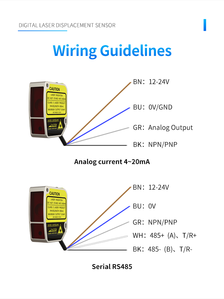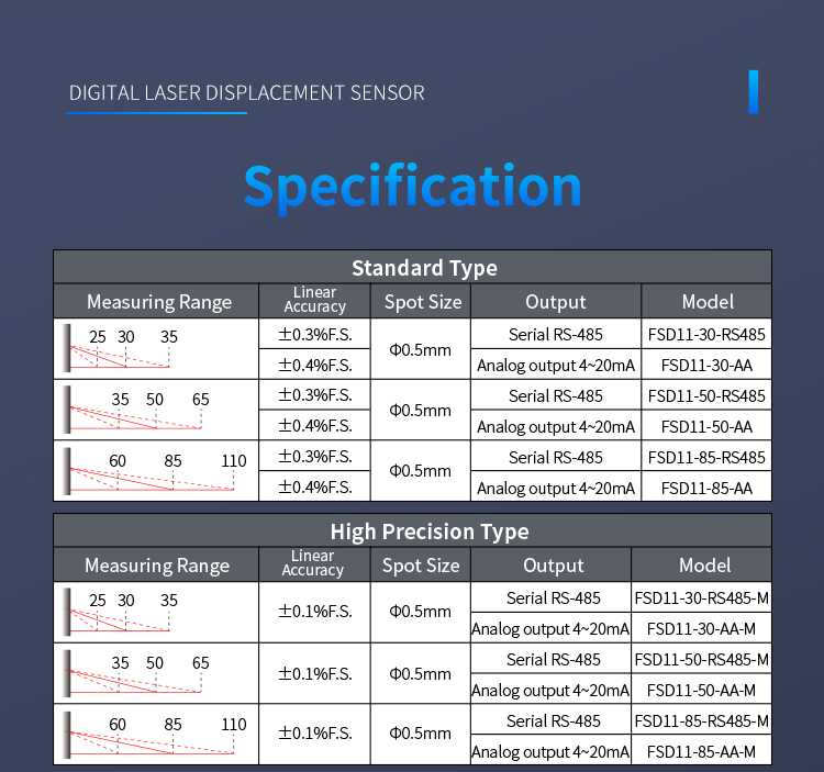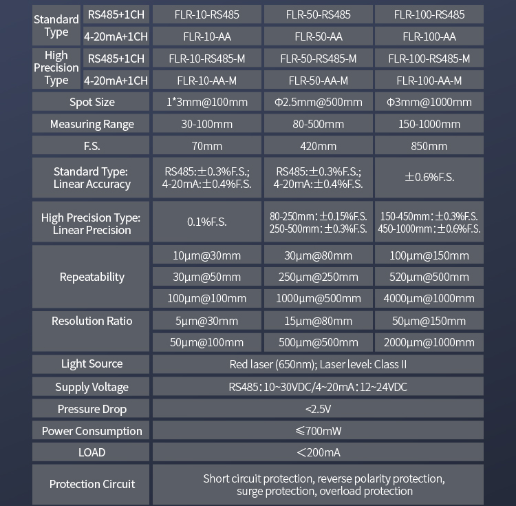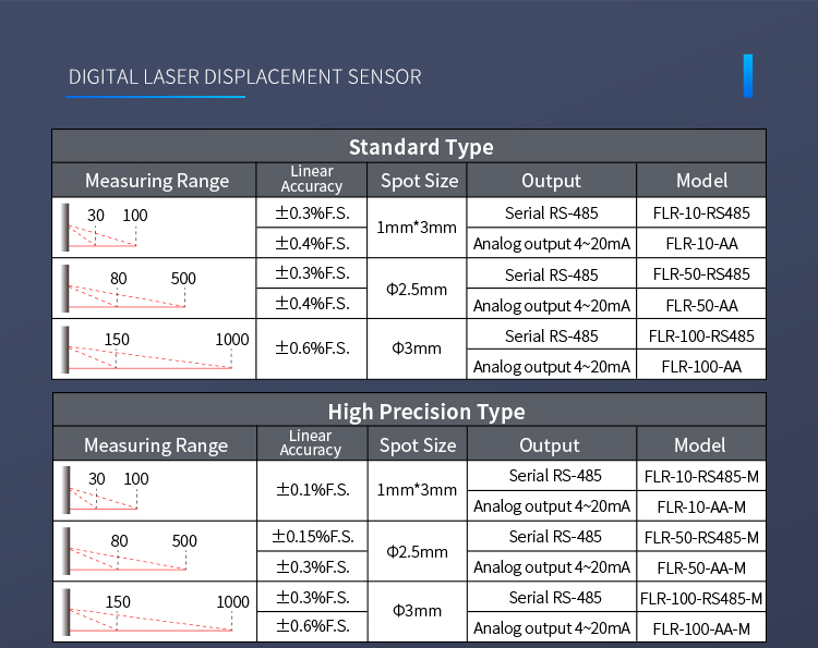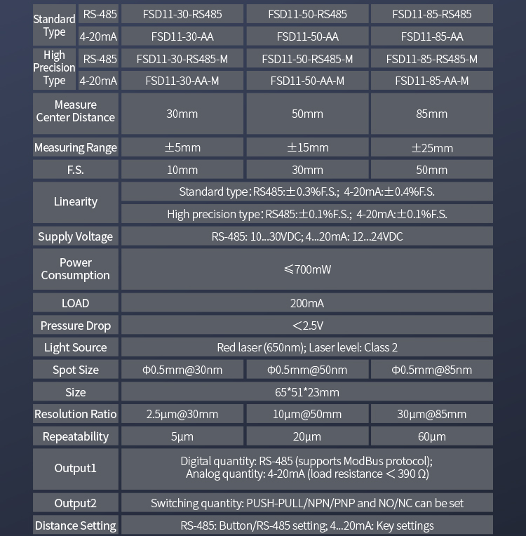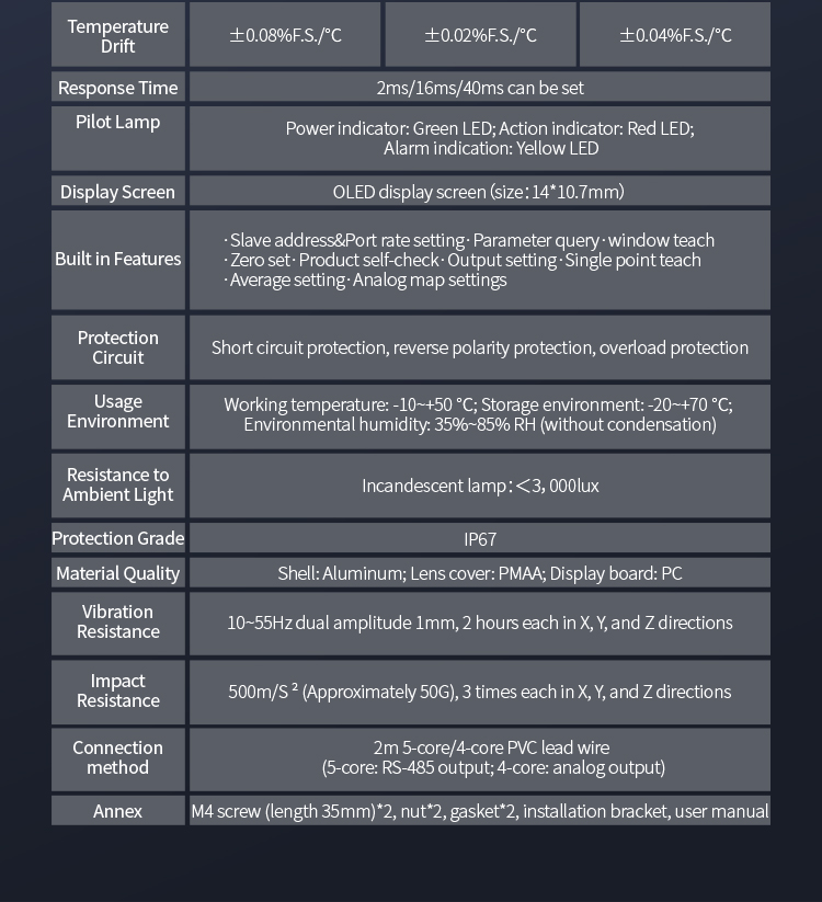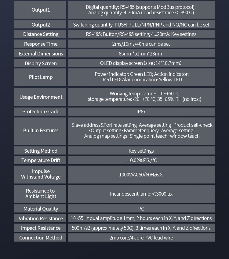 듀얼 버튼 설정을 통해 스위치 출력과 아날로그 전류 출력은 물론 RS485 통신 출력까지 10~850mm 범위에서 유연하게 선택할 수 있어 다양한 사용 요구를 충족합니다.