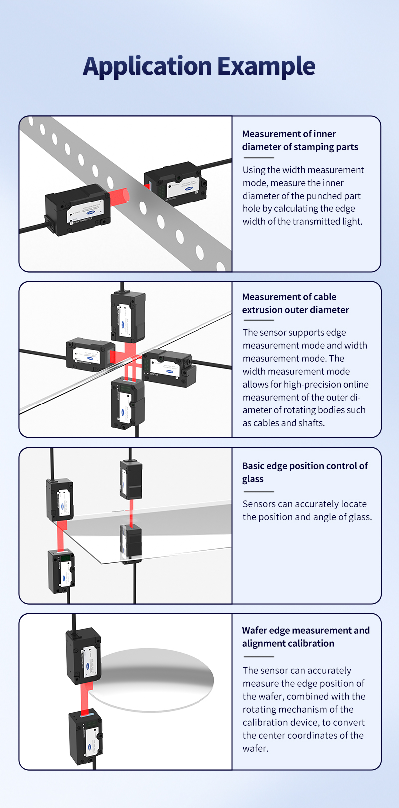 웨이퍼 가장자리 포지셔닝 및 와인딩 데스키 : 반도체 제조의 경우 센서의 소형 설계는 좁은 공간에 내장 될 수 있으며 14*12mm 스팟은 웨이퍼 윤곽을 정확하게 식별합니다.
