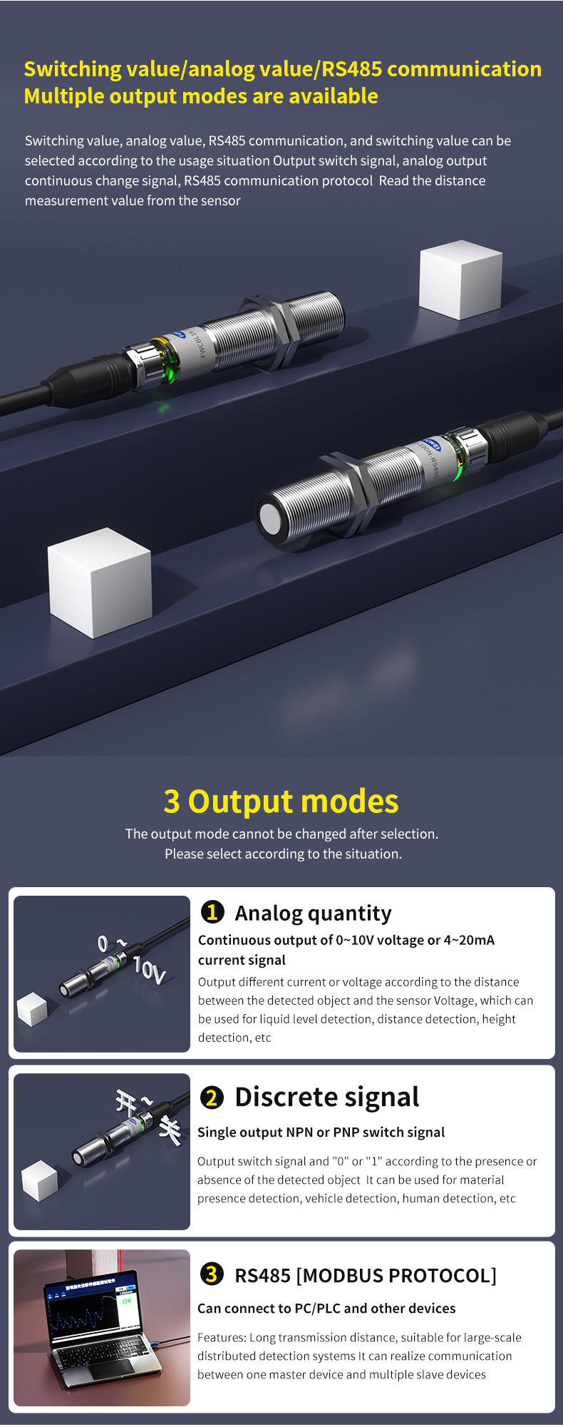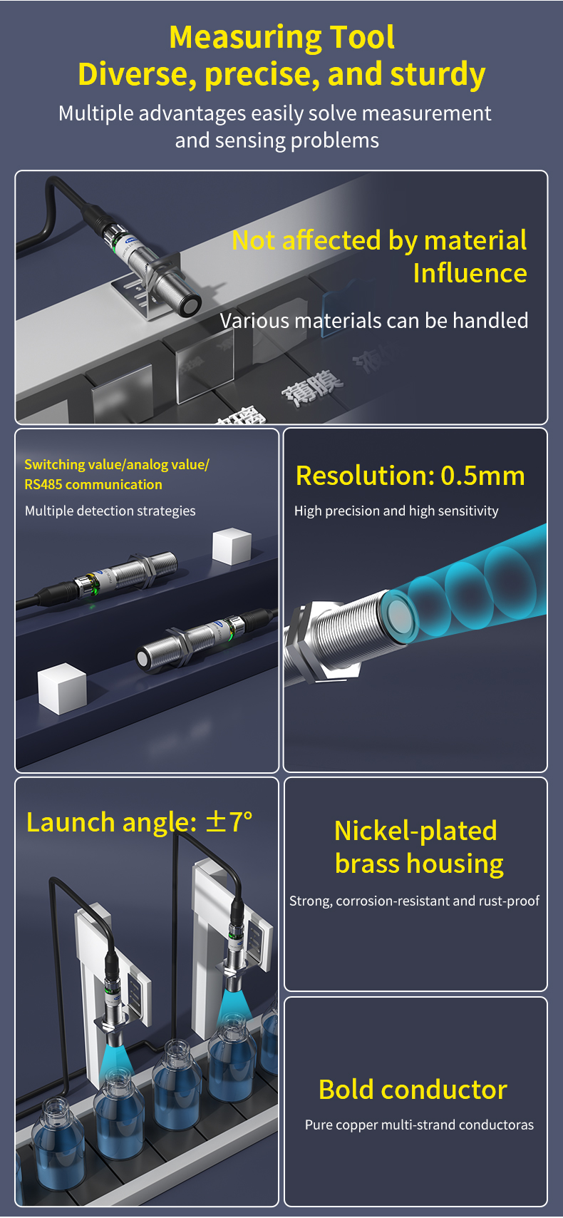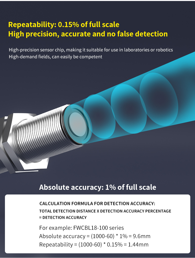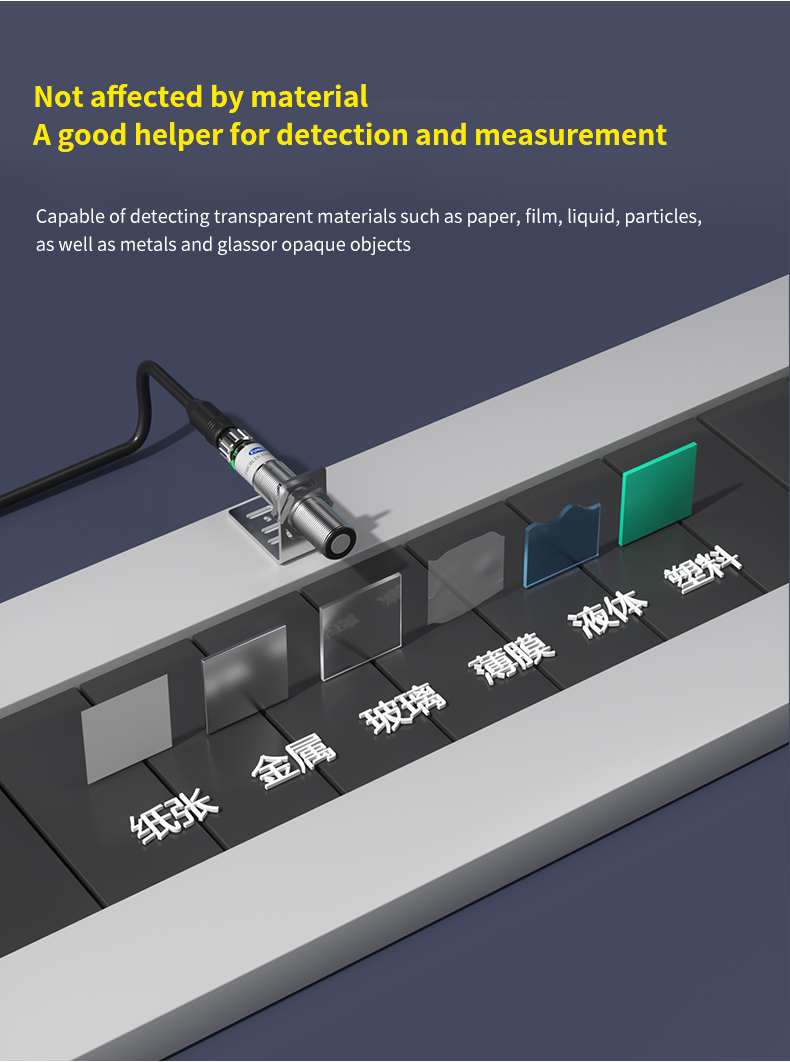 0.5mm 분해능의 높은 정밀도와 좁은 ±7° 방출 각도를 특징으로 하는 이 제품은 최고의 측정 정확도와 뛰어난 간섭 저항을 보장합니다. 빛을 흡수하는 표면, 반사하는 표면, 투명한 표면 등 대상 표면에 관계없이 감지된 물체의 재질이나 색상에 전혀 영향을 받지 않고 안정적인 성능을 제공합니다.